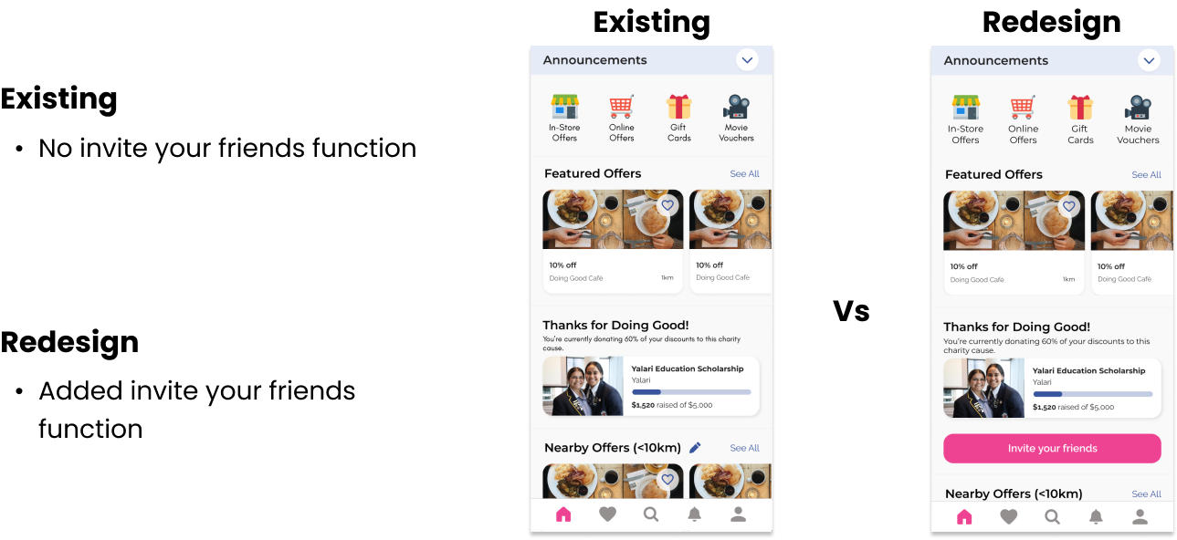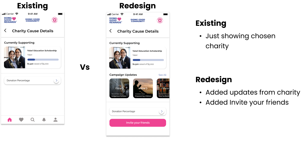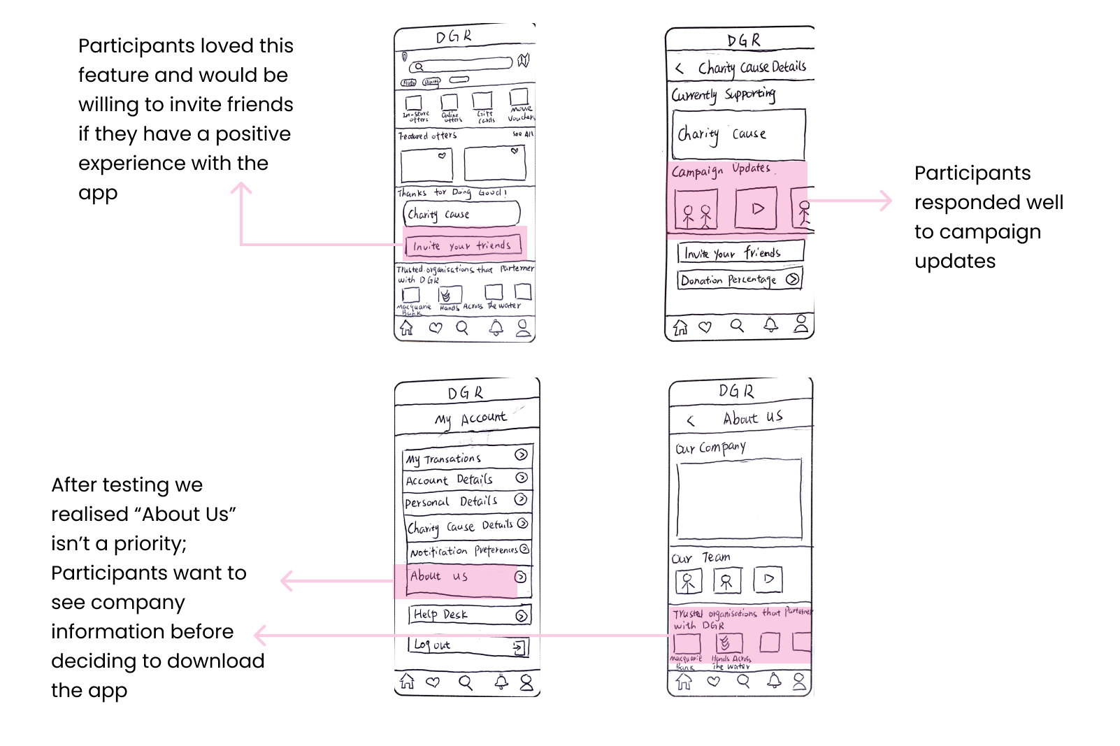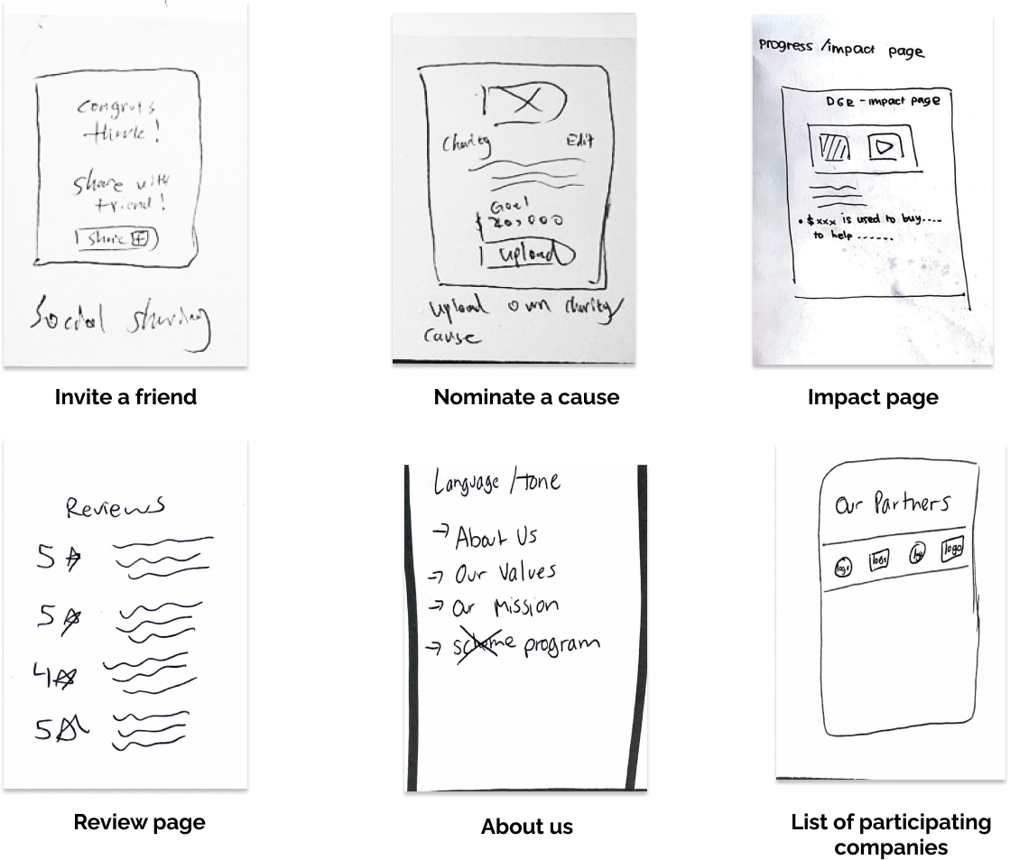 I drew a paper prototype with new features that we came up with and tested it with 6 participants. They responded well to “invite a friend” and “campaign updates“, but “about us“ page didn’t establish their trust as users want to check it before using the app.