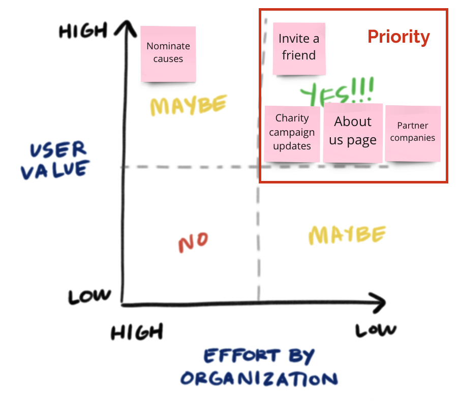 We decided to develop features of inviting a friend, charity campaign updates, about us & partner companies as our priority.