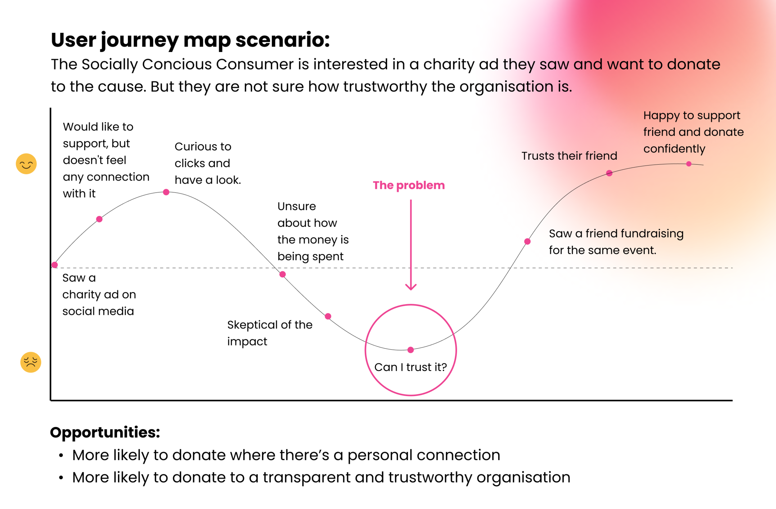 From the research and app evaluation, we found socially conscious consumers are more likely to use the app. They will donate to trusted causes where they have personal connections rather than researching them with initiative.
