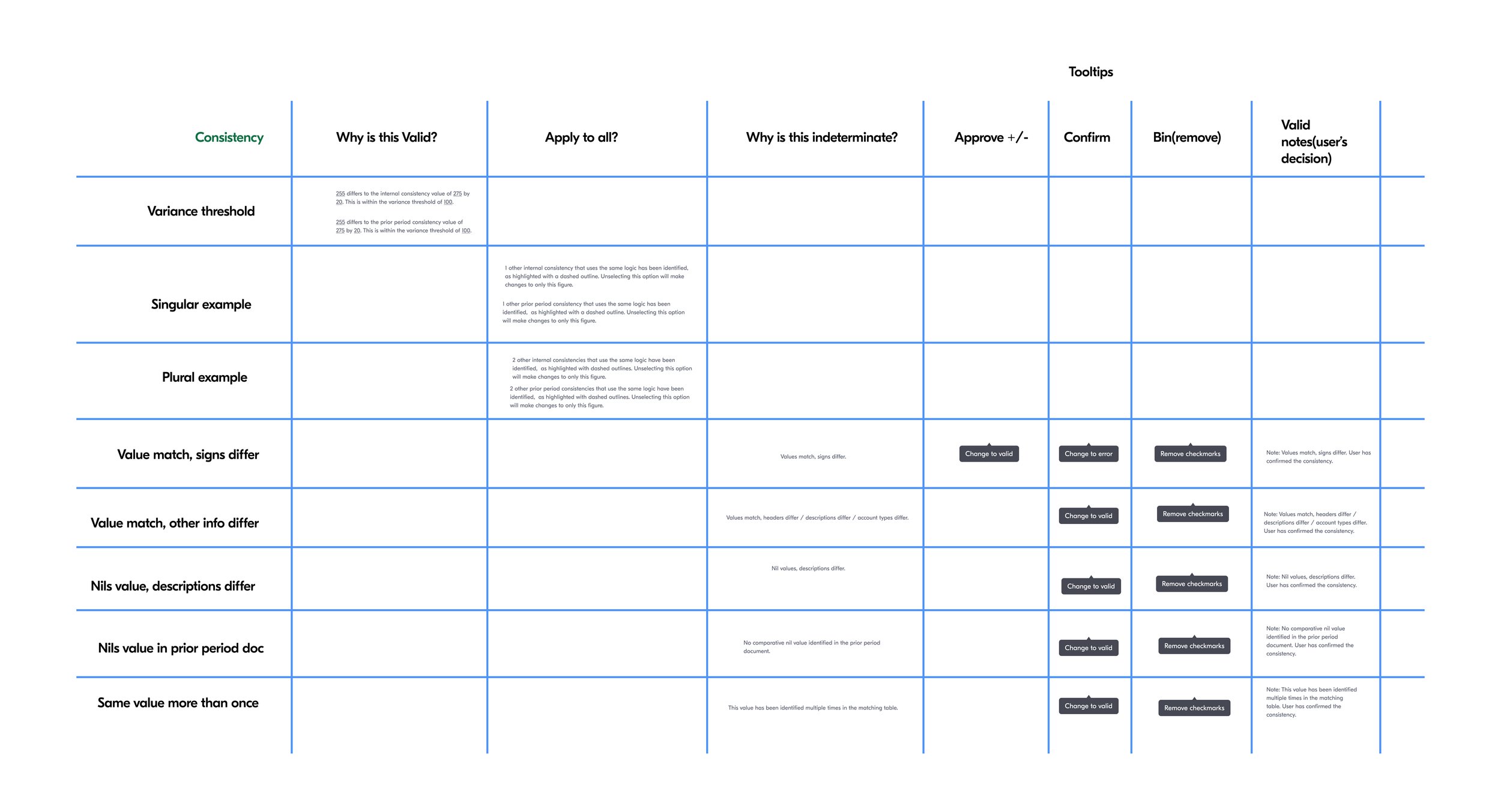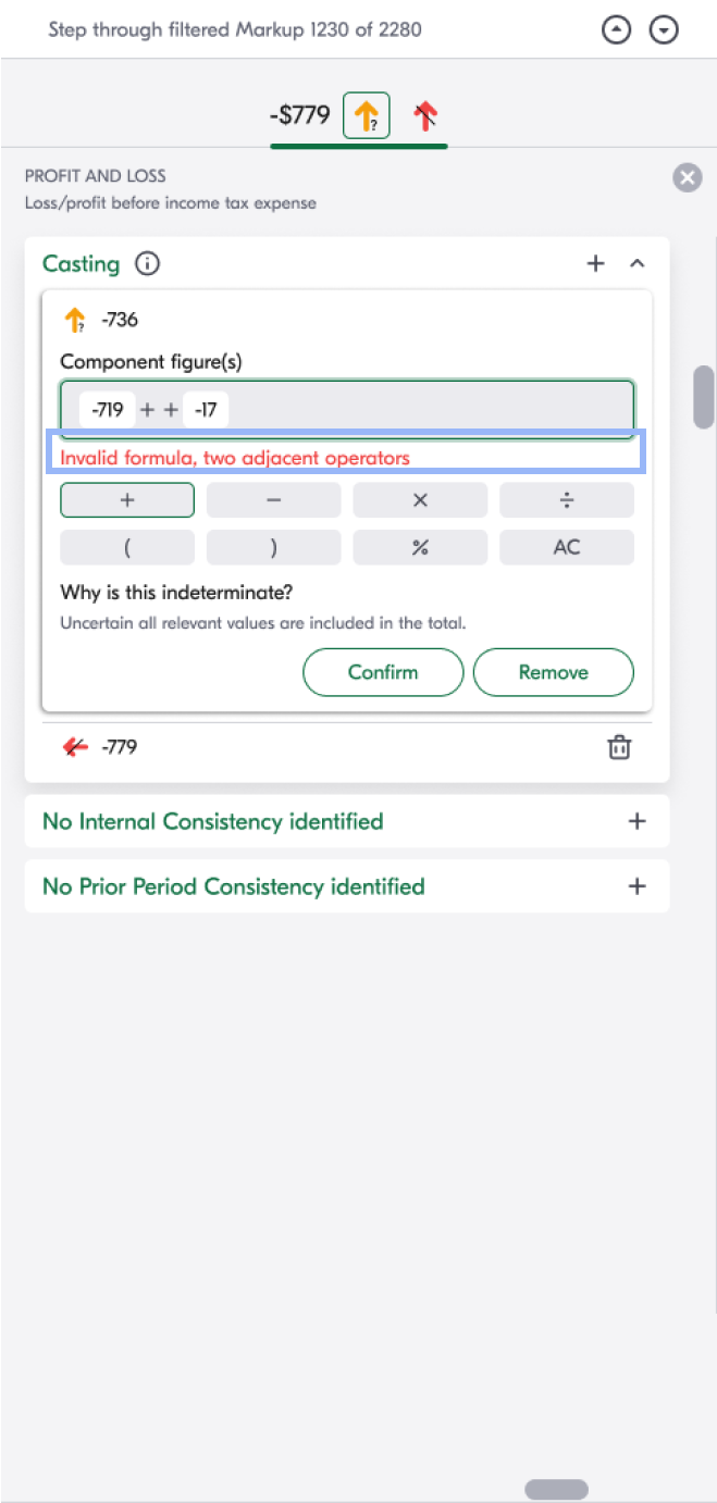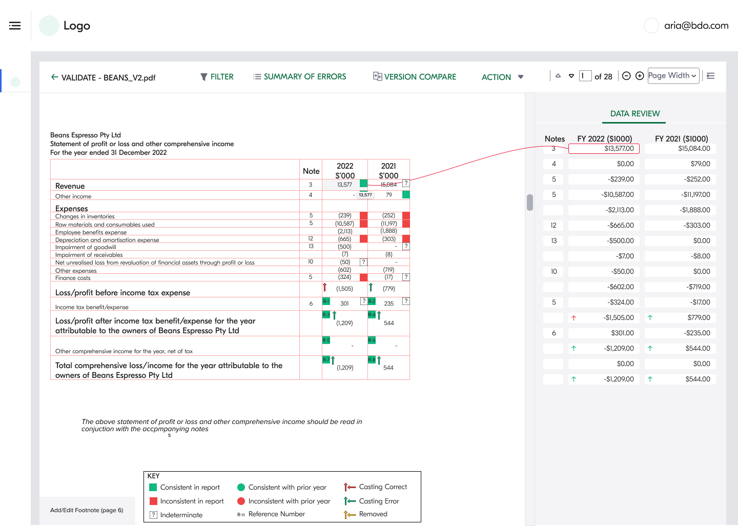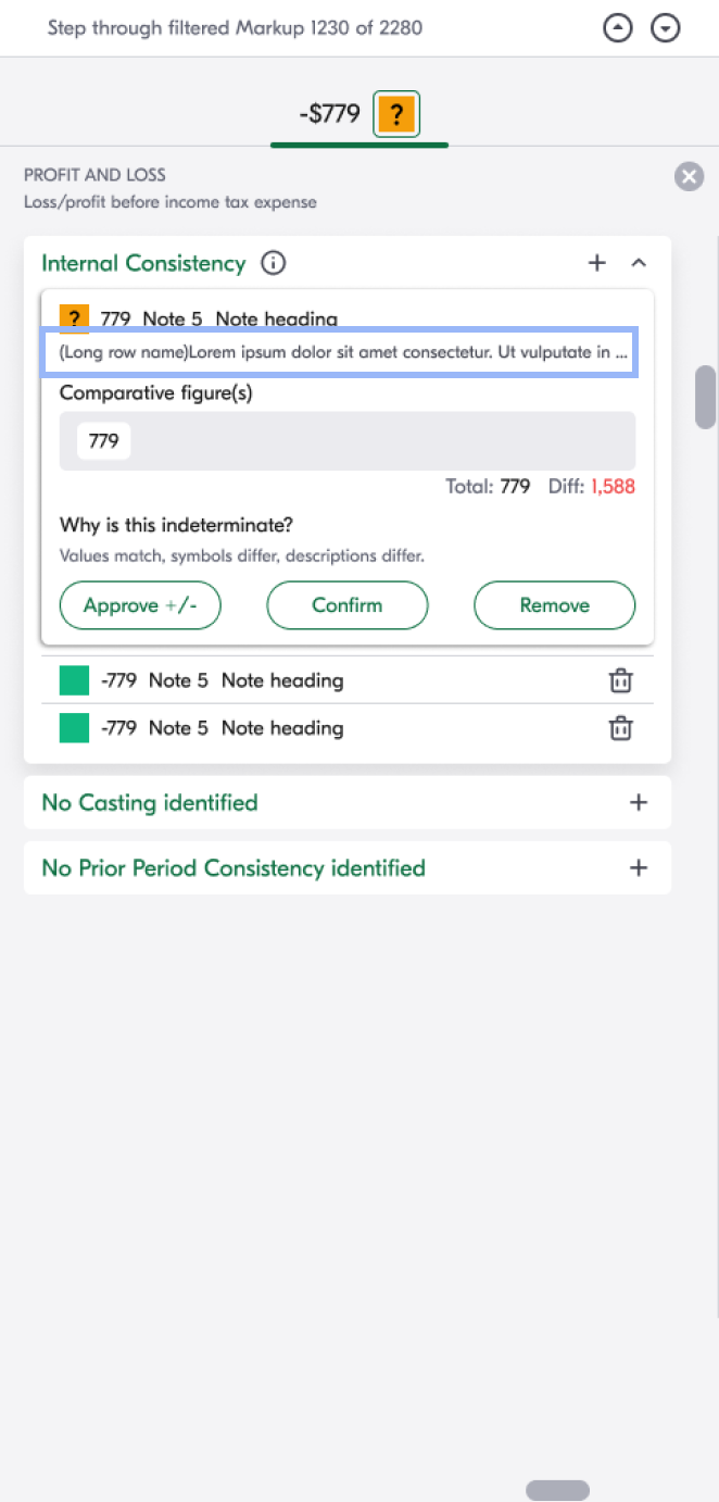 In the example below, this page from a financial statement shows how the previous product indicated data accuracy using red and green checkmarks.