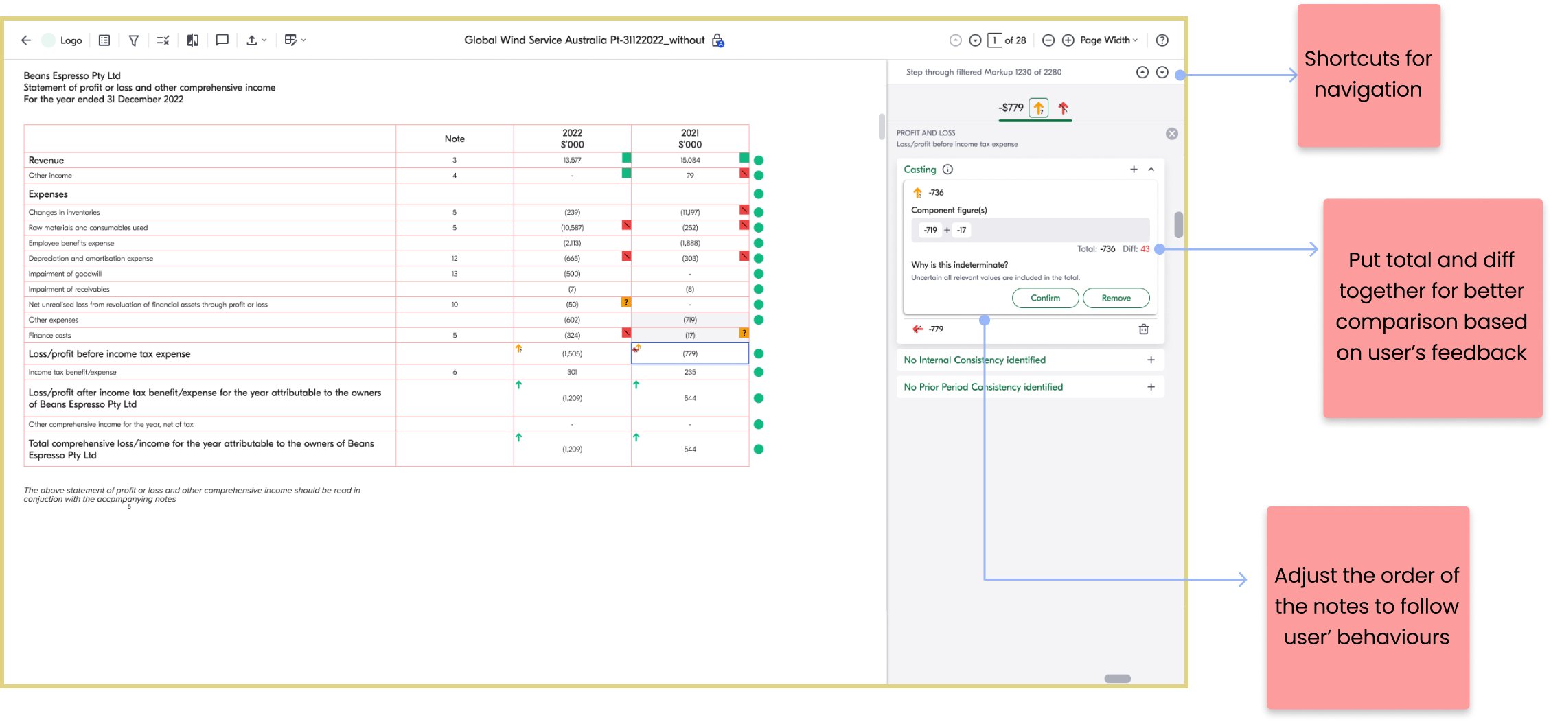 Auditors struggle to modify and annotate financial statements because the old product lacks these features. They must rely on external tools like calculators, PDF editors, and referencing various documents to figure out what and how to modify the figures.