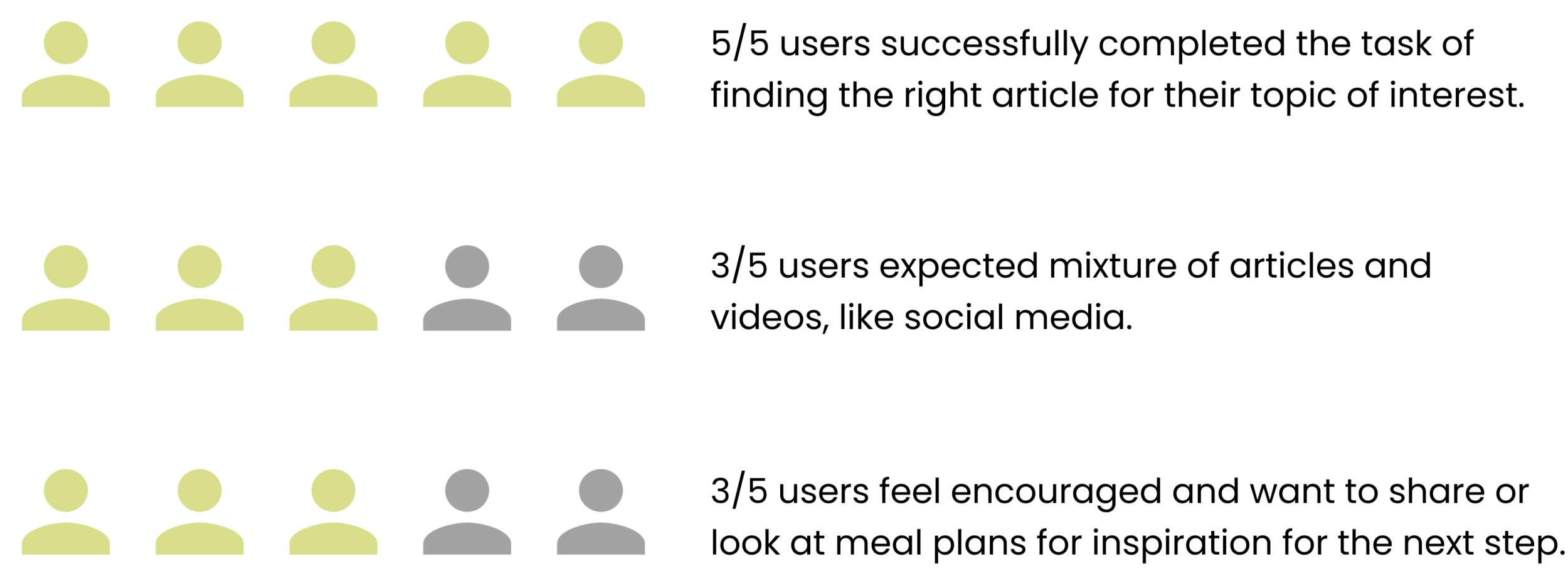 The proposed solution is the MVP design for an app allowing users to access curated resources from professionals and reliable scientific sources in one place. Besides, have success stories from VITA’s in-person program to motivate them. The user that we tested felt encouraged and inspired by the content, they would like to take action on healthy eating after that.